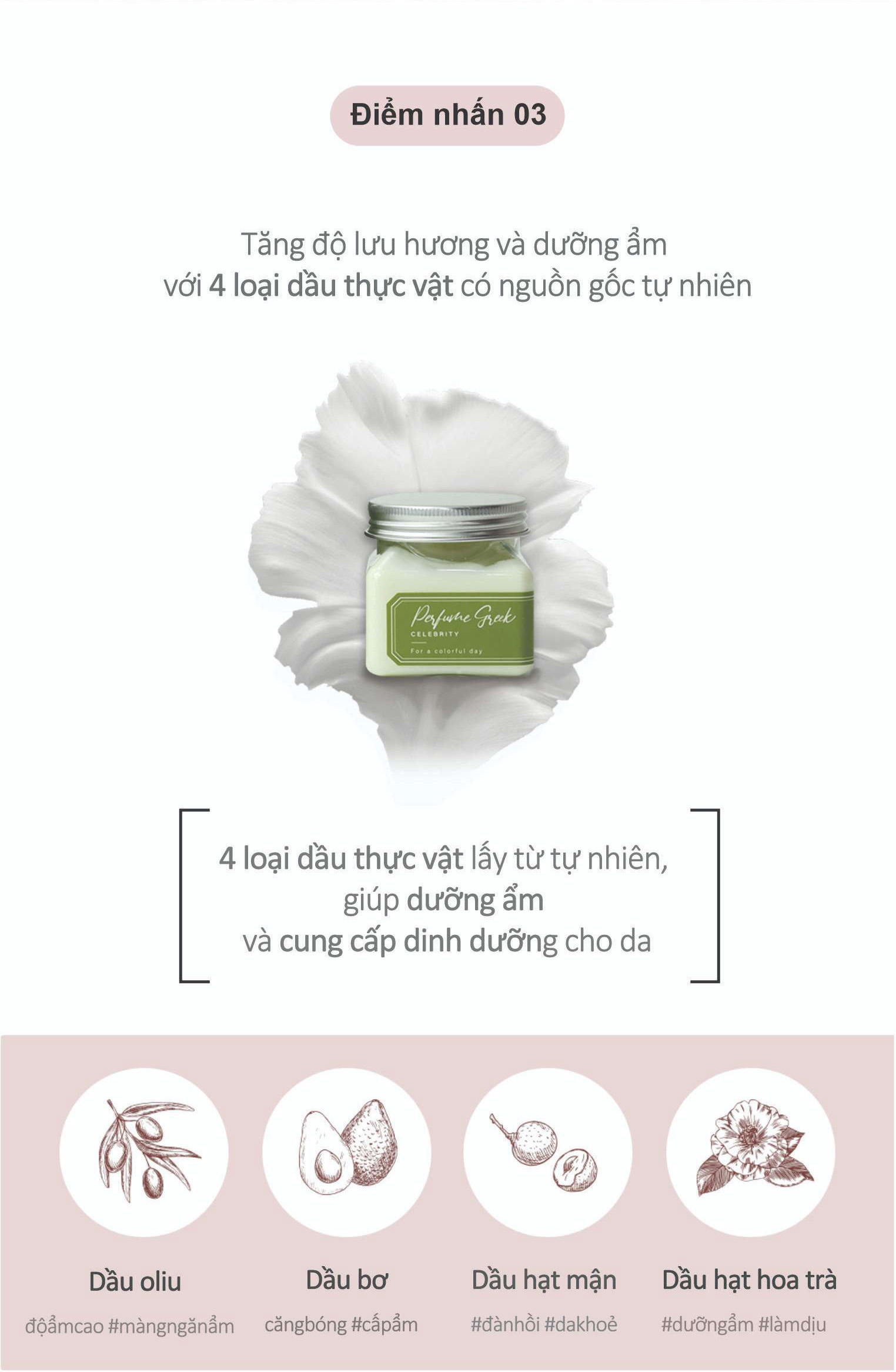 4. Tăng độ lưu hương và dưỡng ẩm với 4 loại dầu thực vật: dầu oliu, dầu bơ, dầu hạt mận, dầu hạt hoa trà.